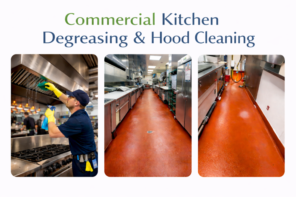 We provide deep cleaning for commercial kitchens and exhaust hoods, removing built-up grease from corners, hard-to-reach areas, and hidden spaces. We clean behind stoves, under equipment, hood systems, filters, walls, and floors, eliminating heavy grease and residue.