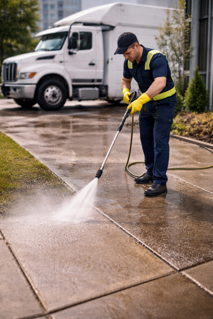 Commercial pressure washing services for sidewalks and storefronts.